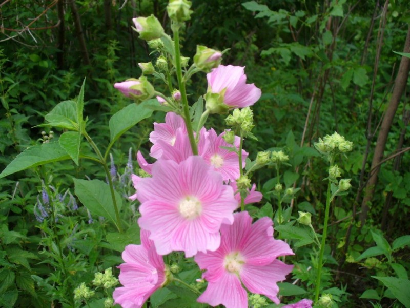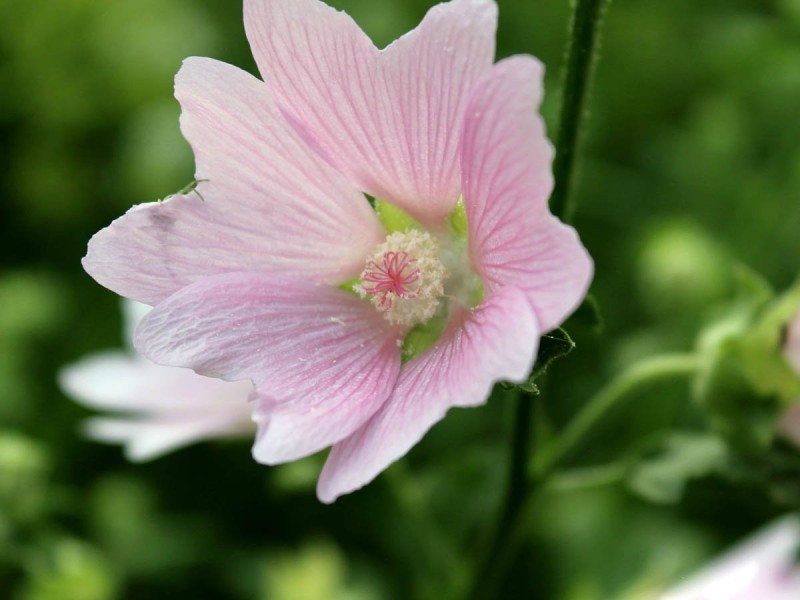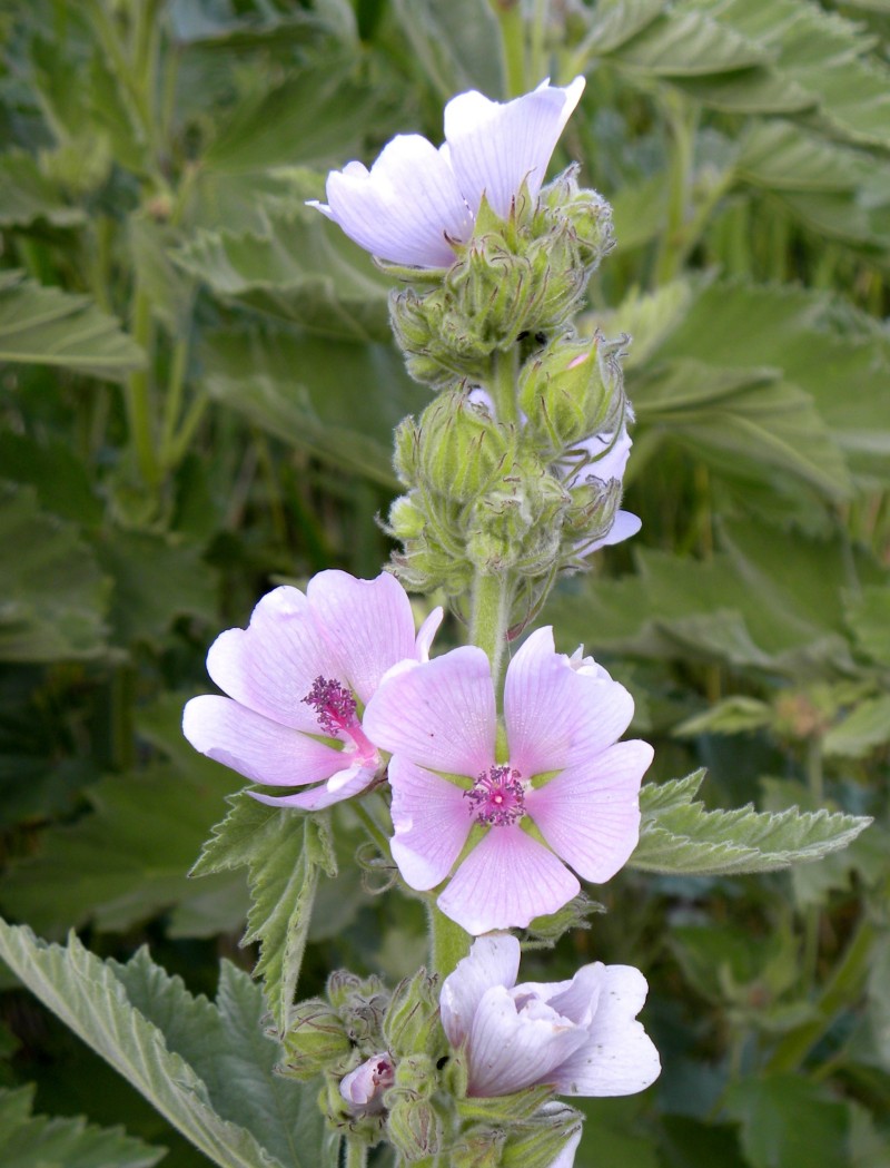 Многолетнее серовато-зеленое травянистое растение семейства мальвовых (Malvaceae), высотой 60 — 150 см. Корневище толстое, короткое, многоглавное, с мощным стержневым корнем, достигающим в длину 50 см. Стебли слабоветвистые, в нижней части одревесневающие, цилиндрические. Листья очередные, длиной 5 — 15 см., бархатисто-войлочно-опушенные, на черешках, верхние цельные, яйцевидные, средние и нижние трех- или пятилопастные, с вытянутой верхушкой, по краю городчато-зубчатые. Цветки пятичленные, правильные, розовые или белорозовые, обоеполые, в диаметре до 2,5 см., расположены в пазухах верхних и средних листьев на коротких цветоножках, с подчашием из 8 — 12 листочков. Плод — плоская, дисковидная, сухая, дробная многосемянка из 15 — 25 плодиков, по спинке густо покрытых звездчатыми волосками. Цветет с июня до сентября, плоды созревают в июле — октябре.