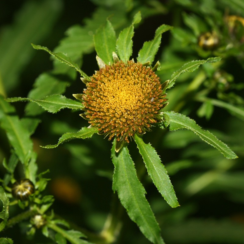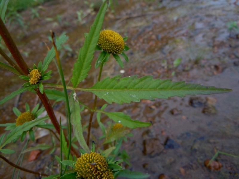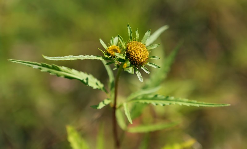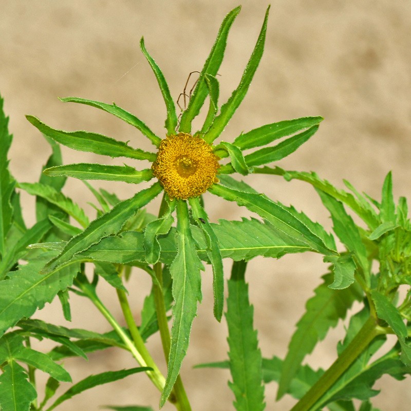 Однолетнее растение семейства сложноцветных (Asteraceae) высотой 20 — 100 см. Стебли прямостоячие, в верхней части ветвистые, голые или слабо опушенные. Листья супротивные, желтовато-зеленые, трех-пятираздельные или рассеченные, с ланцетными или яйцевидно-ромбическими пильчатозубчатыми дольками, иногда частично цельные. Корзинки плоские, их диаметр в два раза больше высоты. Наружные листочки обертки листовидные, в числе 10 — 14, значительно превышают обертку и окружают ее в виде лучей. Краевые цветки ложноязычковые, золотисто-желтые, бесплодные; срединные — трубчатые, обоеполые. Плоды — сплюснутые клиновидные семянки диаметром около 4 мм.; ости по длине равны семянке или чуть короче ее; семянки голые, но по краям и остям несут щетинки, обращенные вниз. Цветет в июле — сентябре.