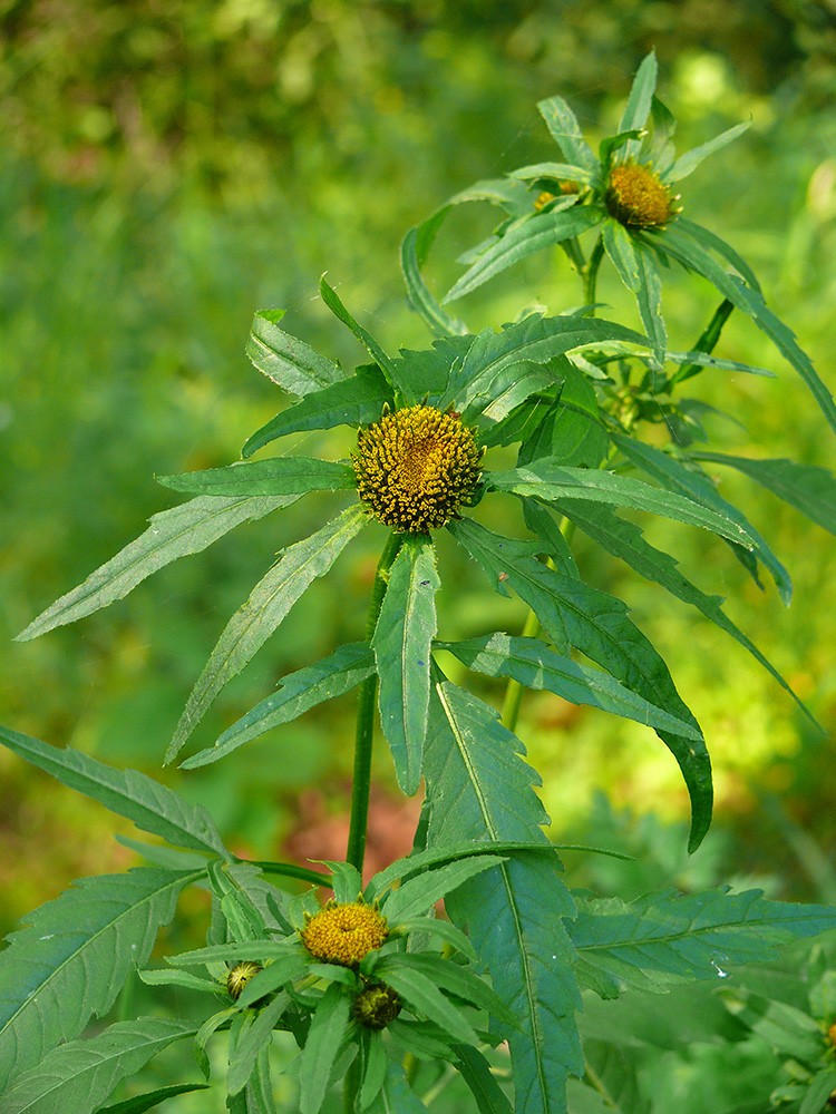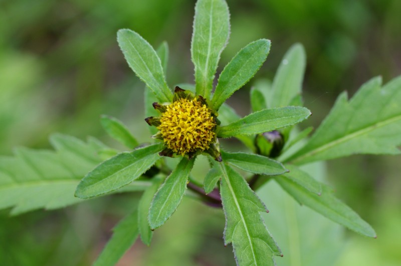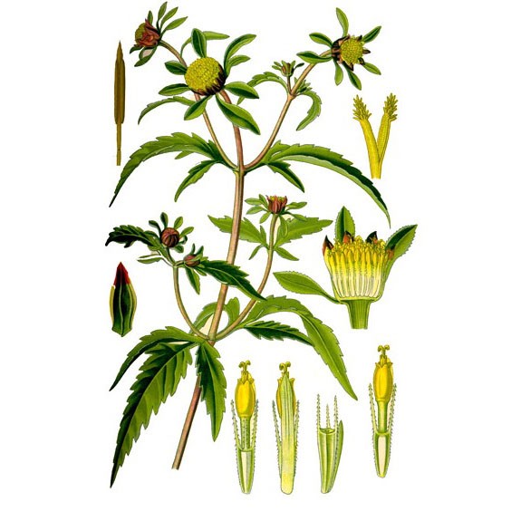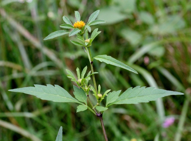Однолетнее травянистое растение семейства сложноцветных (Asterасеае) с супротивными ветвями высотой 30 — 60 (100) см. Листья супротивные, трех-пятираздельные, длиной до 7 см., иногда цельные, с крылатыми черешками. Цветки желтые; краевые — язычковые, бесплодные; срединные — трубчатые, обоеполые. Соцветия — корзинки диаметром до 1,5 см., с многолистными двурядными обертками; наружные листочки обертки в числе 5 — 8, сходные по форме с листьями. Плоды — клиновидные сплюснутые семянки длиной до 8 мм. и шириной до 3 мм. Они снабжены двумя зазубренными щетинками, которые цепляются за шерсть животных и одежду людей. Цветет в июне — сентябре, плоды созревают в августе — сентябре.