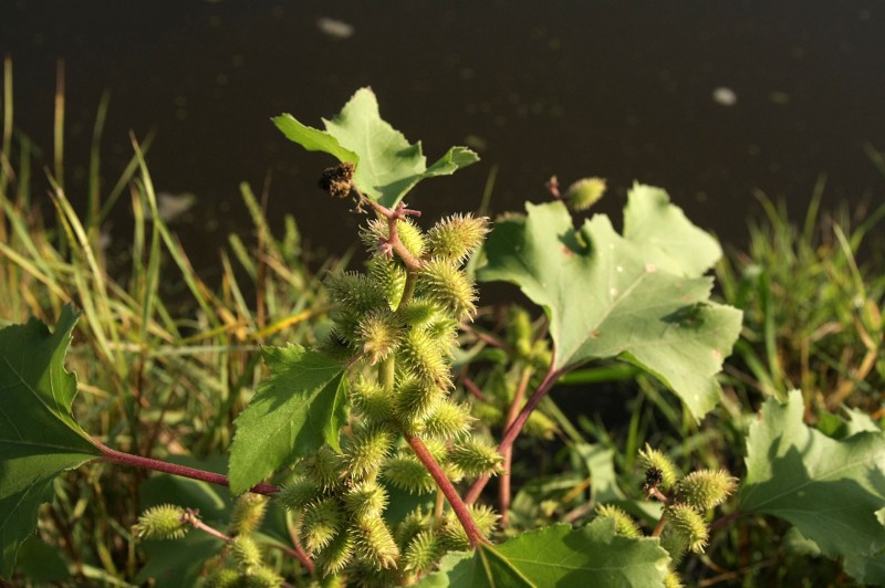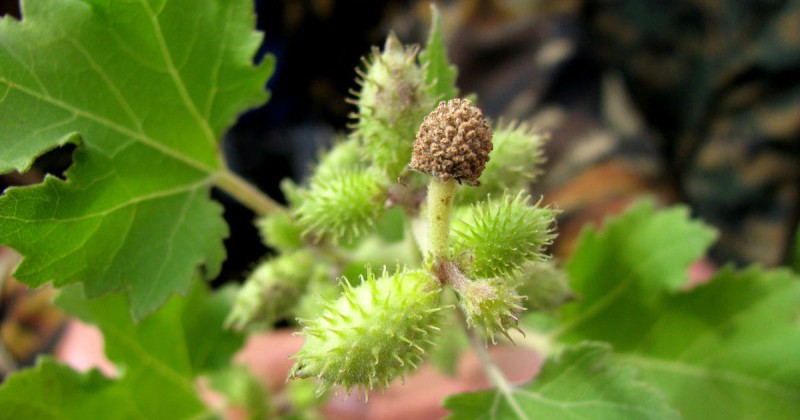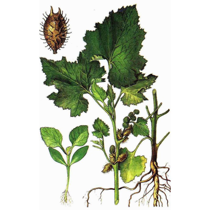 Однолетнее растение семейства сложноцветных (Asteraceae) высотой до 70 см. Стебель крепкий, ветвистый, как и листья, серовато-зеленый, с мягким опушением. Листья очередные, черешковые, сердцевидные, трех-пятилопастные, по краю надрезаннозубчатые. Цветки трубчатые, мелкие, зеленоватые, в мелких корзинках (тычиночные и пестичные на одном растении), расположены пучками в пазухах листьев. Пестичные (женские) корзинки при плодах серо-зеленые, покрыты прямыми шипиками, на верхушке с двумя крупными крючковато изогнутыми шипами. Плоды — гладкие эллиптические семянки. Цветет в июне — августе.