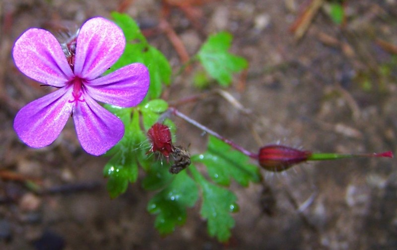 Однолетнее, реже двулетнее растение из семейства гераниевых (Geraniaceae) высотой до 45 см. с восходящими ветвистыми стеблями, покрытыми отстоящими длинными волосками, простыми и частично железистыми. Нижние стеблевые листья в очертании пятиугольные, пальчато-рассеченные, верхние — почти тройчатые; конечный сегмент листьев с черешочком, боковые сегменты почти сидячие, в очертании ромбические, глубокоперистораздельные, тонкие, с обеих сторон волосистые. Цветоносы с двумя цветоножками, торчащими вверх, при плодах отклоненными. Чашелистики по краям и на спинке щетинисто опушенные, с длинной остью. Лепестки длиной 7 — 12 (15) мм., в два раза длиннее чашелистиков, вверху цельные, закругленные, бледно-пурпуровые. Плод дробный, распадающийся на односеменные части; створки плода сетчатоморщинистые. Цветет в мае — сентябре, плодоносит в июне — октябре. Растение имеет сильный неприятный запах.