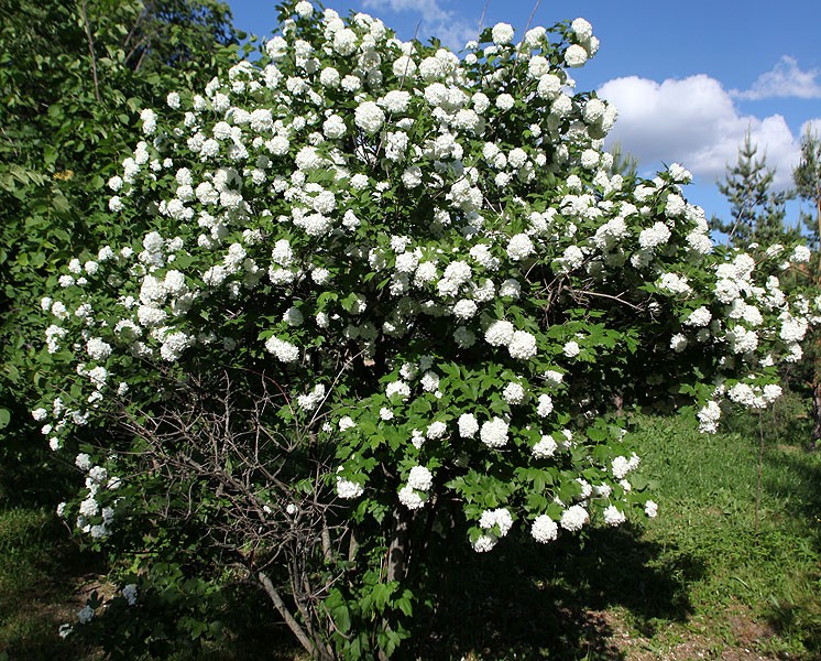 Кустарник из семейства жимолостных (Caprifoliaceae) высотой до 4 м., с серовато-бурой трещиноватой корой. Листья супротивные, округлые или яйцевидные, длиной 5 — 10 см., трех-, пятилопастные, реже цельные, черешковые. Соцветия щитковидные. Цветки белые, пятичленные, двух типов: краевые — бесплодные, с крупными колесовидными венчиками диаметром до 2,5 см.; средние — дающие плоды — с более мелким венчиком (диаметром около 0,5 см.). Плоды — ярко-красные яйцевидные или шаровидные костянки диаметром до 1 см., с плоской косточкой.