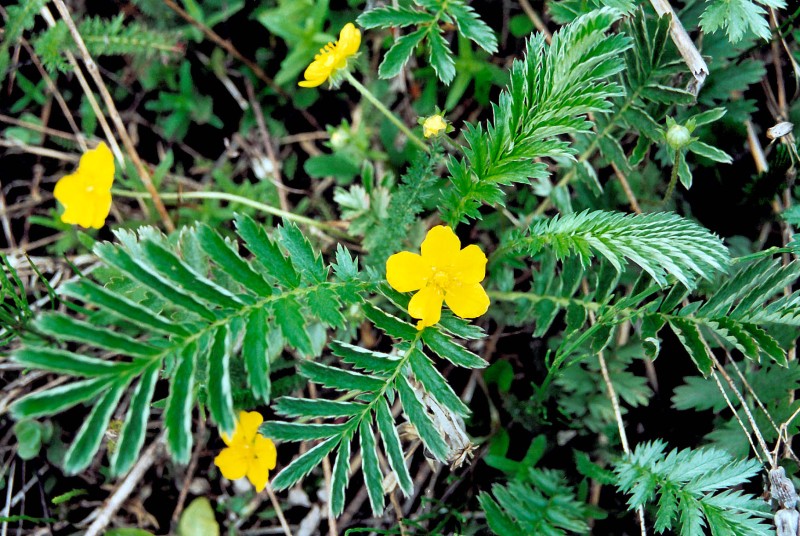 Многолетнее травянистое растение из семейства розоцветных (Rosaceae) с мясистыми корнями и ползучими, укореняющимися в узлах побегами, достигающими 20 — 80 см. длины. Листья непарноперистые, до 20 см. длиной, с 6 — 10 парами продолговатых листочков, сверху — зеленых, голых, снизу — беловатых из-за густого шелковисто-войлочного опушения. Цветки одиночные, желтые, с 5 лепестками, расположены на длинных (до 10 см. длины) цветоножках, выходящих из пазух листьев в узлах побегов. Плоды — многоорешки, распадающиеся на довольно крупные плодики — орешки. Цветет в мае — августе.