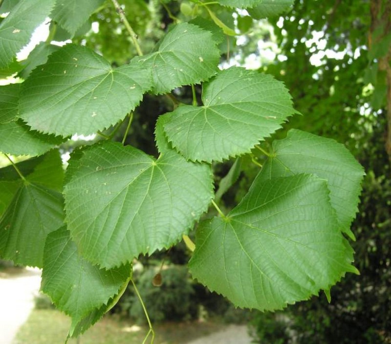 Листья до 14 см., округло-яйцевидные, сверху тёмно-зелёные, голые, снизу бледнее, с пучками светлых волосков в углах жилок, на черешках 2 — 6 см. длиной. Листья распускаются на две недели позже, чем у липы мелколистной.
