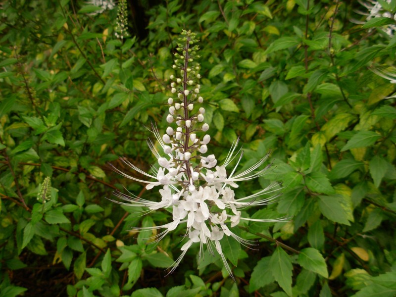 Цветки на верхушках стеблей и ветвей сидят в пазухах листьев по 3 штуки, образуя кистевидные соцветия. Они длинные, неправильной формы, четырёхтычиночные, бледно-фиолетовые. Цветет в июле-августе, плодоносит в октябре.