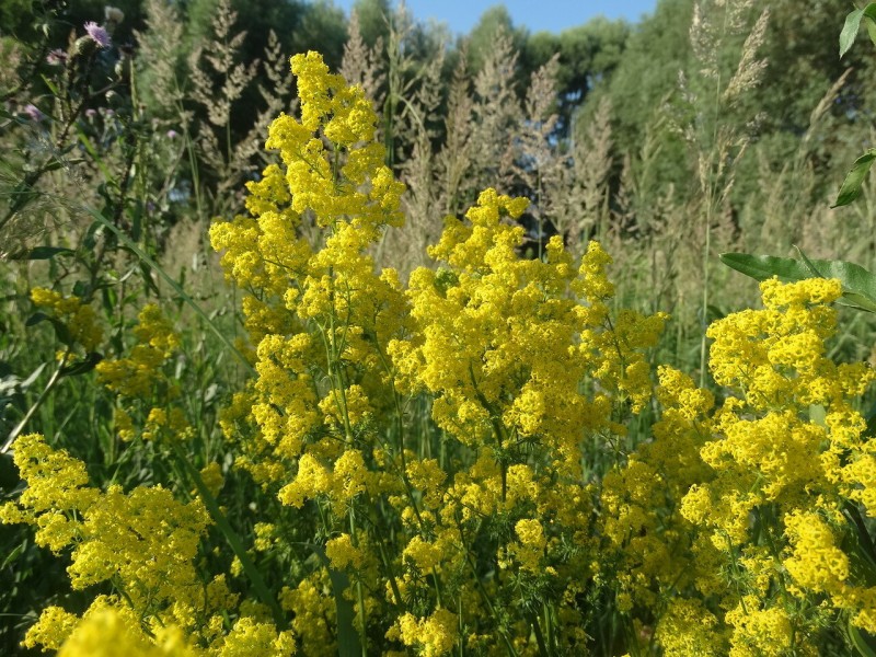 Многолетнее травянистое растение семейства мареновых (Rubiaceae) с длинным, тонким, разветвленным корневищем. Стебли прямые, в узлах несколько утолщенные, простые или ветвистые, 30 — 80 см. высоты, с 4 выступающими ребрами. Листья узколинейные или нитевидные, остроконечные, с завернутыми краями, сверху темно-зеленые, блестящие, голые, снизу светло-зеленые, расположены по 6 — 15 в мутовках. Цветки мелкие, с 4 лепестками, ярко-желтые, ароматные, собраны в верхушечные метельчатые густые или раскидистые соцветия. Плоды шаровидные, мелкие, голые орешки. Цветет в июне — июле; семена созревают в августе — сентябре.