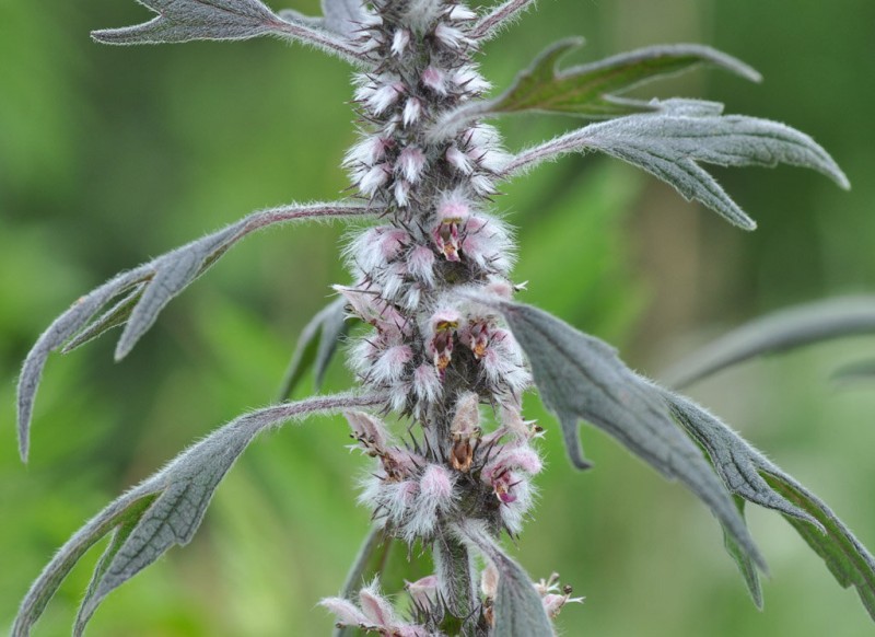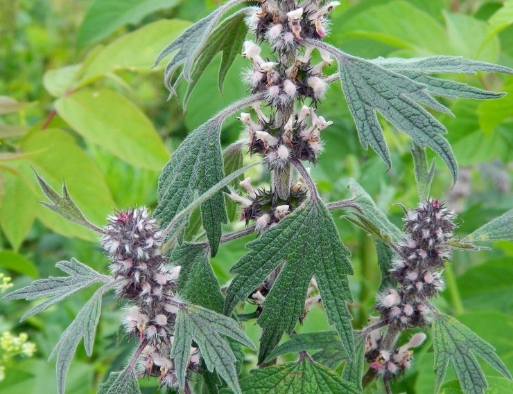 Многолетнее травянистое растение семейства губоцветных (Lamiaceae) с укороченным косым или почти вертикальным деревянистым корневищем, переходящим в стержневой корень, густо усаженный придаточными корнями. Стебли высотой 50 — 150 см., прямостоячие, крепкие, четырехгранные, полые, в верхней части разветвленные. Стебли и черешки листьев густо опушены мягкими оттопыренными волосками. Листья супротивные, черешковые; нижние — округлые или яйцевидные, почти до середины пальчато-пятираздельные; средние — продолговато-эллиптические или ланцетные, трехраздельные; верхние листья узкие, цельные. Цветки розово-фиолетовые, двугубые, собраны густыми мутовками в пазухах верхних листьев, образуя на конце стебля длинное прерывистое колосовидное соцветие. Плоды распадаются на 4 орешка. Цветет в июне — августе.