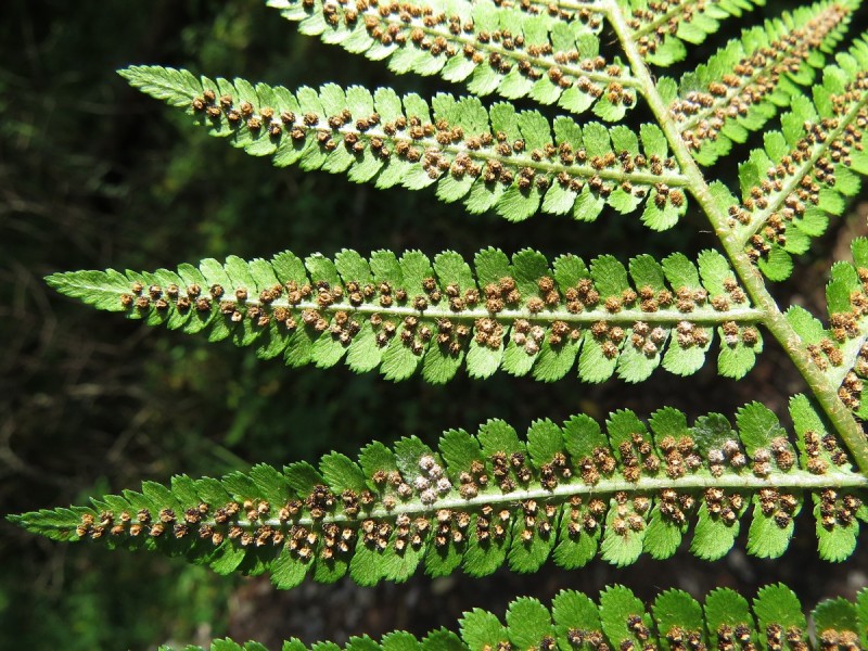 К середине лета на нижней поверхности листа развиваются спорангии, сидящие группами и образующие сорусы, расположенные в два четких ряда по бокам средней жилки долей первого порядка и прикрытые пленчатыми, почковидными покрывальцами. Спороношение длится с конца июня до сентября; споры созревают в августе — сентябре.
