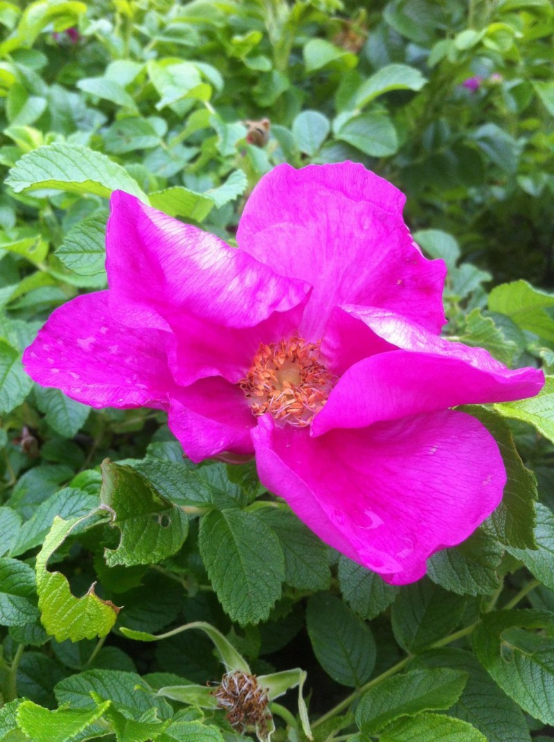Кустарник семейства розоцветных (Rosaceae), высотой до 1,5 м. Ветви толстые, прямостоячие, усажены многочисленными мелкими прямыми или изогнутыми игольчатыми шипами и щетинками, причем опушены и шипы тоже. На старых ветвях кора серая или темно-серая, на молодых — буроватая или буро-коричневая, местами покрыта прижатым сероватым пушком. Листья из 5 - 9 округлых или эллиптических листочков с зубчатым краем. Листочки плотные, кожистые, сверху голые, лоснящиеся и отчетливо морщинистые, что и отражено в видовом названии, снизу обильно опушенные и нередко даже войлочные. Черешки опушенные, с широкими беловолосистыми снизу прилистниками. Цветки крупные, диаметром 6 — 8 см., карминово-розовые, очень ароматные, собраны в малоцветковые соцветия, реже расположены поодиночке. Плоды — ярко-красные или темно-оранжевые, мясистые, шаровидные или несколько сплюснутые, диаметром до 3 см., с не опадающими при созревании прямостоячими чашелистиками. Цветет с июня до поздней осени, поэтому на одном кусте одновременно бывают зрелые плоды и цветки. Плоды начинают созревать уже в середине лета.