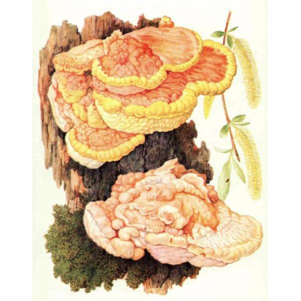 Трутовый гриб семейства полипоровых (Polyporaceae). Плодовые тела 10 — 40 см. в диаметре, 1 — 4 см. толщины, вееровидные, черепитчато- или розетковидно сросшиеся у основания, в молодом возрасте мягкие, мясистые, оранжево- или серно-желтые, часто с розовым оттенком и желтоватым краем. Позже плодовые тела становятся волокнистыми, сухими и выцветают до светло-желтого цвета. Трубчатый слой серно-желтый. Мякоть желтовато-беловатая, мягкая и сочная, довольно ломкая, кисловатая на вкус. Запах слабый, сначала лимонный, а позже становится неприятным, похожим на мышиный. Споровый порошок беловатый с желтоватым оттенком.