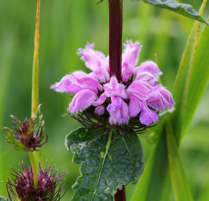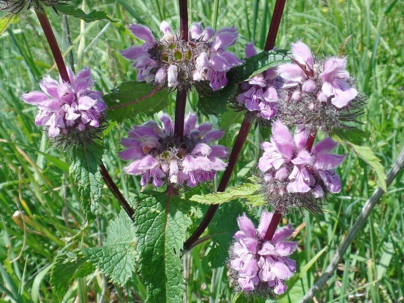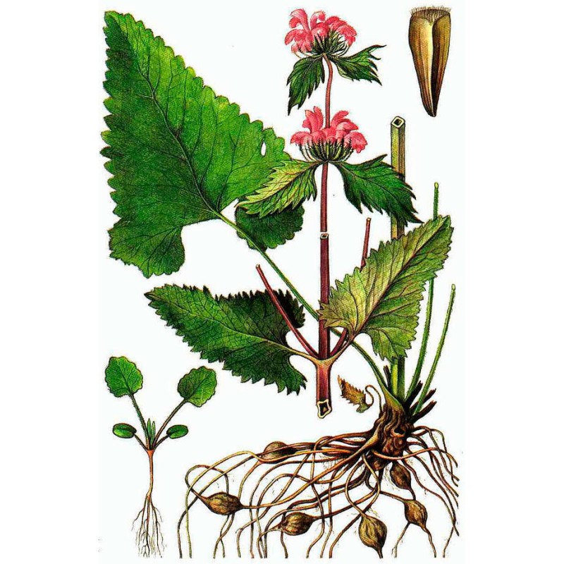Многолетнее травянистое растение семейства губоцветных (Lamiaceae) высотой 60 — 120 см. с длинными корнями, на которых выражены клубневидные утолщения, называемые в народе земляными орешками. Стебли прямостоячие, обычно окрашенные в лиловый цвет. Листья супротивные, сверху темно-зеленые, голые или с рассеянными волосками, снизу более светлые, от голых до обильно опушенных (иногда только по жилкам). Нижние листья треугольносердцевидные, крупногородчатые по краям, с длинными черешками; средние — яйцевидно-ланцетные с сердцевидным основанием, с городчато-пильчатыми краями; верхние — ланцетные, остропильчатые по краям, сидячие. Цветки крупные, собраны на верхушках стеблей в плотные мутовки, удаленные друг от друга. Чашечка трубчато-колокольчатая, длиной до 10 мм., с пятью полукруглыми зубцами, заканчивающимися шиловидным отклоненным острием. Венчик длиной 1,5 — 2 см, розовый или лиловый, снаружи до трубки опушен звездчатыми волосками с удлиненным лучом (трубка голая), двугубый; верхняя губа сводовидная, наверху неравнозубчатая, изнутри по краю с густой бородкой волосков; нижняя губа трехлопастная, с широкой, слегка выемчатой средней долей и мелкими яйцевидными боковыми. Цветет в июне — июле, плоды созревают в июле — августе.