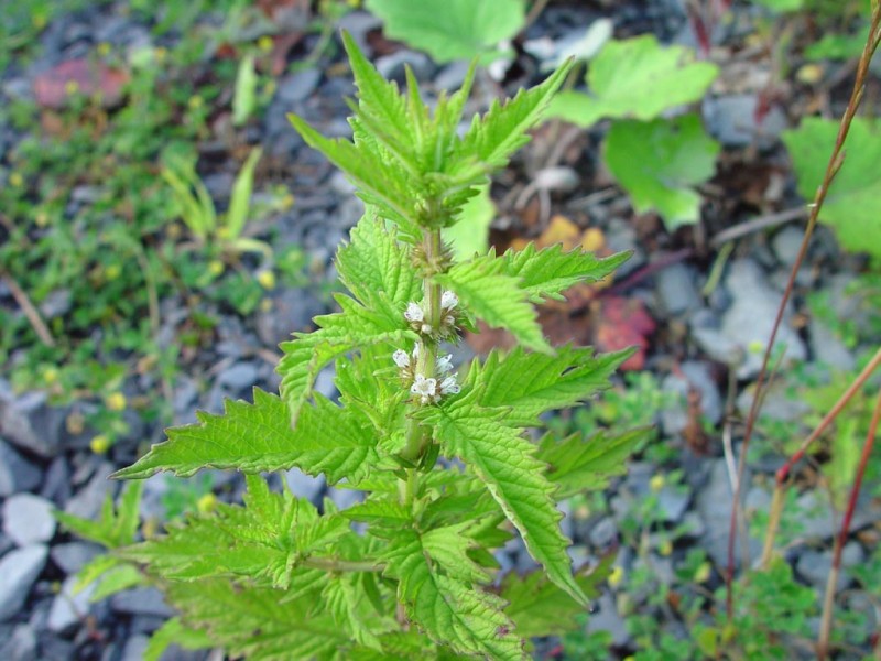 Многолетнее травянистое растение семейства губоцветных (Lamiaceае) с членистым шнуровидным корневищем и тонкими подземными побегами. Стебли прямостоячие или от основания восходящие, высотой 30 — 90 см., четырехгранные, бороздчатые. Листья продолговато-эллиптические или ланцетно-эллиптические (нижние — могут быть почти перистонадрезанными), короткочерешковые, выемчато- и неравномерно-зубчатые или крупнопильчатые по краю, с обеих сторон опушены короткими одноклеточными или длинными многоклеточными волосками, с примесью железок, особенно снизу по жилкам. Цветки мелкие, многочисленные, собраны в плотные пазушные мутовки. Прицветники мелкие, линейно-ланцетные, переходящие в колючку, по краям реснитчатые. Чашечка колокольчатая, почти правильная, железисто опушенная, надрезанная на пять линейно-ланцетных зубцов с длинным шиловидным окончанием. Зубцы превышают венчик или равны ему. Венчик четырехлопастный, желтовато-белый с пурпурными точками, снаружи слабо волосистый, колокольчатый, с почти равными долями (лишь одна верхняя более широкая). Плодики усеченно обратнояйцевидные, уплощенные, длиной около 1,5 мм. Цветет в июне — октябре, плоды созревают в июле — октябре.